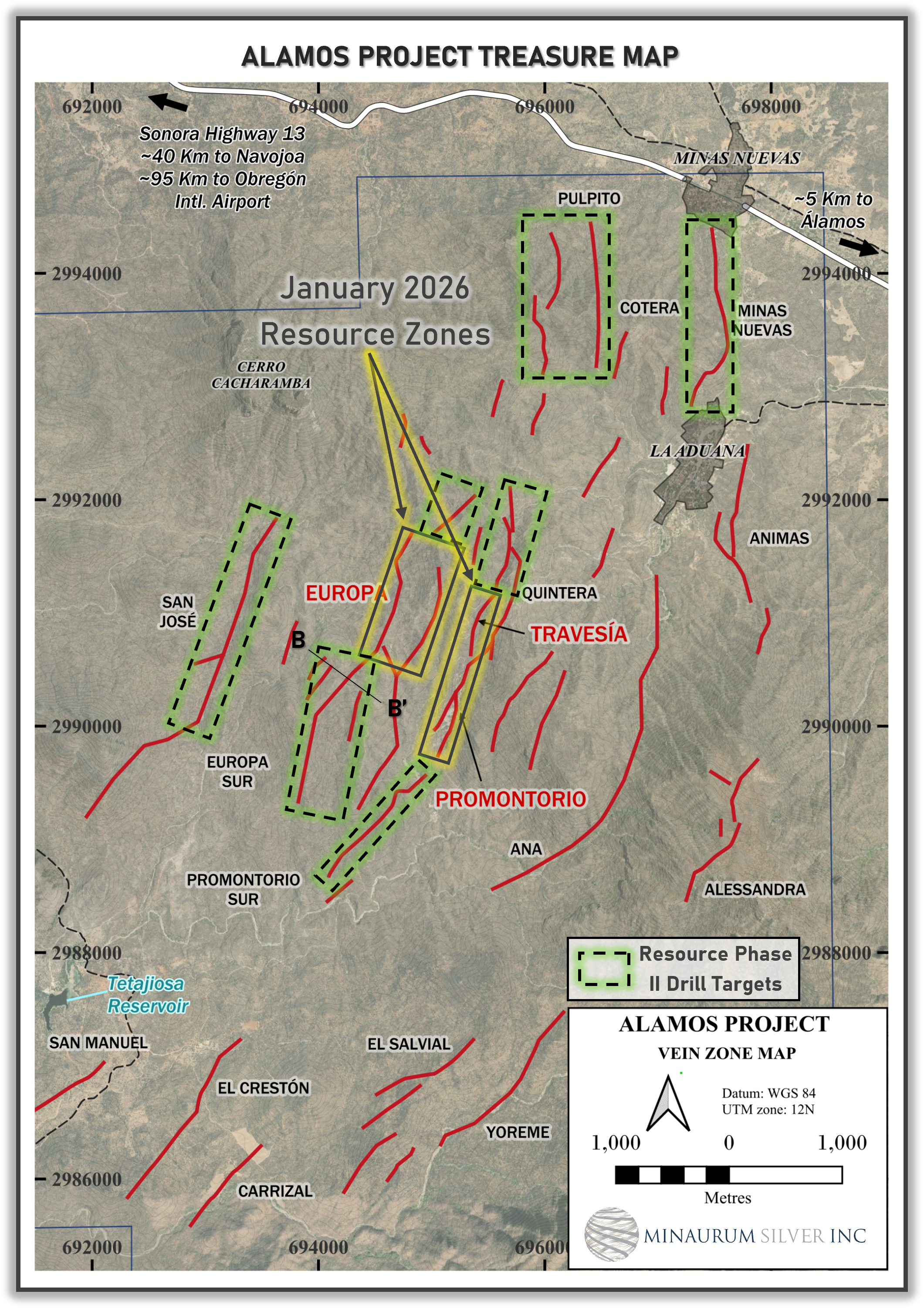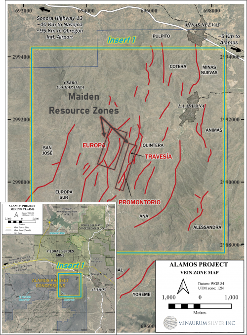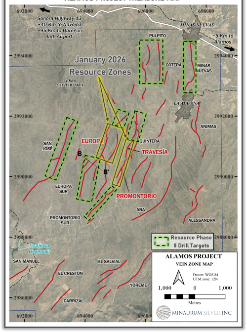 Alamos hosts an initial inferred resource estimate of 55 million ounces AgEq grading 320 g/t AgEq (see Minaurum news release dated January 28, 2026 and Resource section above) from just 3 of the 26 vein zones namely: Promontorio, Europa, and Travesia vein targets.