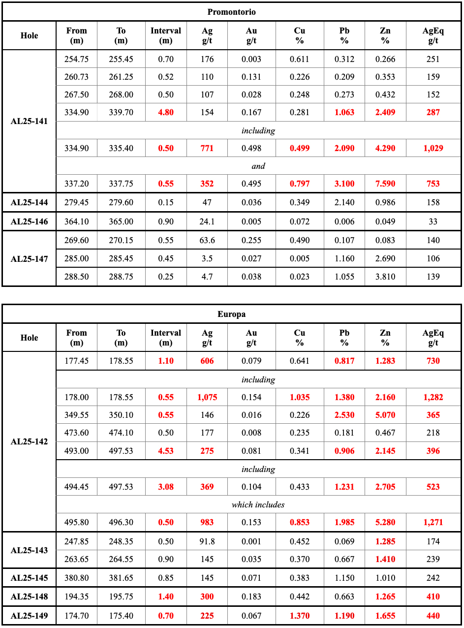 Hole AL25-142 returned 4.53 m of 396 g/t AgEq including 0.50 m of 1,271 g/t AgEq containing 983 g/t Ag (0.15 g/t Au, 0.85% Cu, 1.98% Pb, 5.28% Zn); and hole AL25-148 reported 1.40 m of 410 g/t AgEq. Along-strike and to the south, hole AL25-143 returned 0.90 m of 239 g/t AgEq and AL25-149 reported 0.70 m of 440 g/t AgEq also containing a high-grade interval of 300 g/t Ag. Drilling continues to step out along strike and down dip at Europa. (Table 1 and Figures 3 and 4).