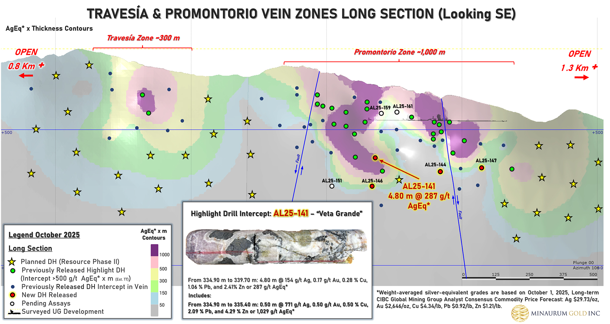 - 4.80 m of 287 g/t silver equivalent (“AgEq”) including 0.50 m of 1,029 g/t AgEq (Hole AL25-141)