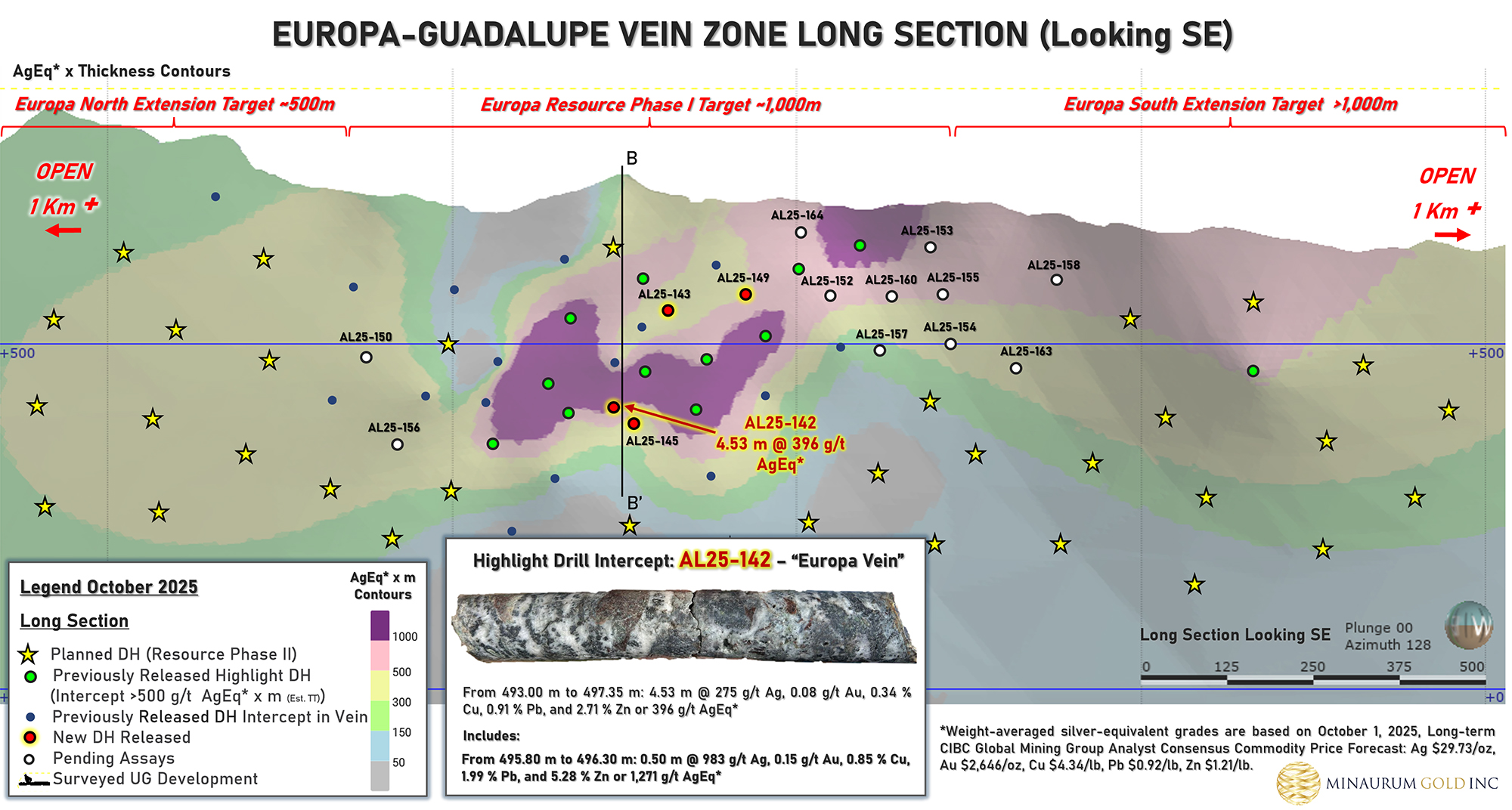 “Drilling continues to demonstrate the continuity of high-grade silver mineralization down dip and along strike” stated Darrell Rader, President and CEO of Minaurum Gold. “At the Europa stacked vein system, hole AL25-142 vein intersected three intervals of significant mineralization, yielding targets for further drilling and resource development.”