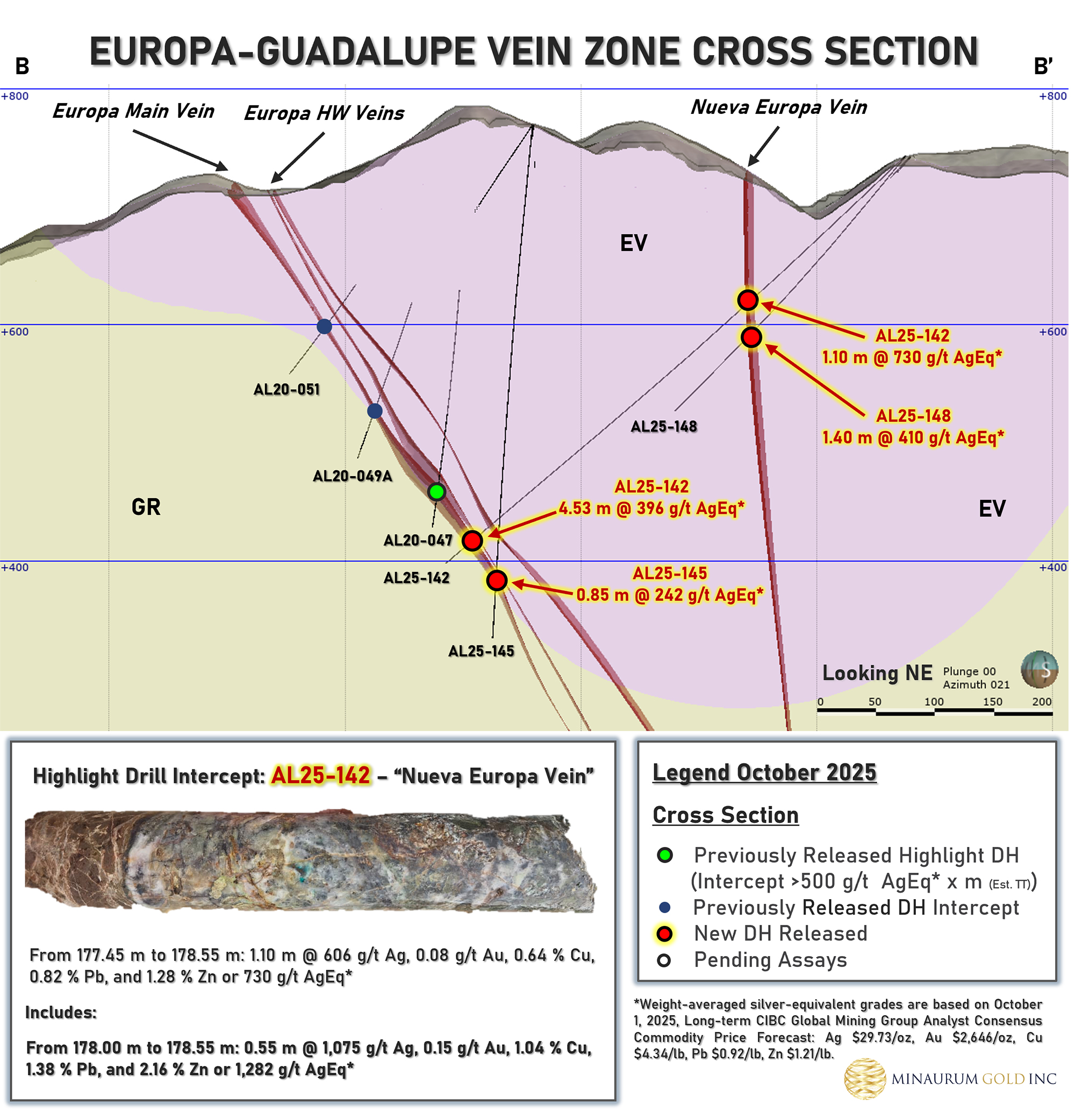 Drilling has extended high-grade mineralization down-dip and along-strike (see Minaurum news release dated October 16, 2025). In the Nueva Europa vein zone, an interval of 1.10 m of 730 g/t AgEq with high grade silver of 606 g/t Ag including 0.55 m of 1,075 g/t Ag.