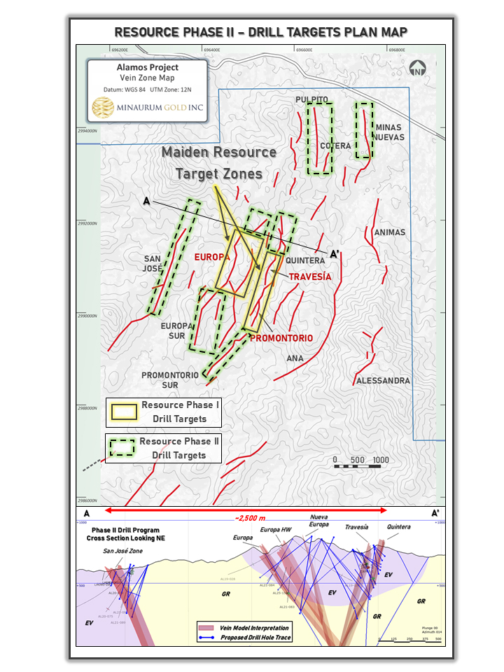 The expanded 50,000 m drill program in Phase II will continue to focus on infill and step-out results from the Phase I Drilling (see Minaurum news release dated November 27, 2025), with multiple rigs on site and 263 drill pads already permitted across the project. The program will include step-out holes at the Europa and Travesia silver shoots, as well as additional drilling at the historic Quintera and Minas Nuevas mines and the more recent discoveries at Promontorio Sur, Cotera, Pulpito, and San Jose vein zones (Figure 1).