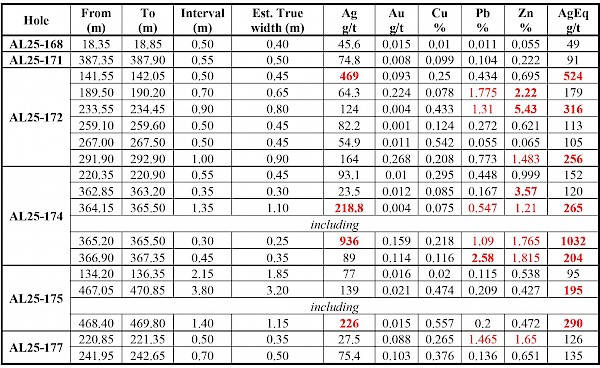 0.50 m of 524 g/t silver equivalent (“AgEq”) in hole AL25-172, 0.30 m of 1,032 g/t AgEq in hole AL25-174 and 1.40 m of 290 g/t AgEq in hole AL25-175. At Travesía-Quintera, step-out drilling returned 2.55 m of 197 g/t AgEq, including 0.40 m grading 567 g/t AgEq in hole AL25-173 (see Table 1).