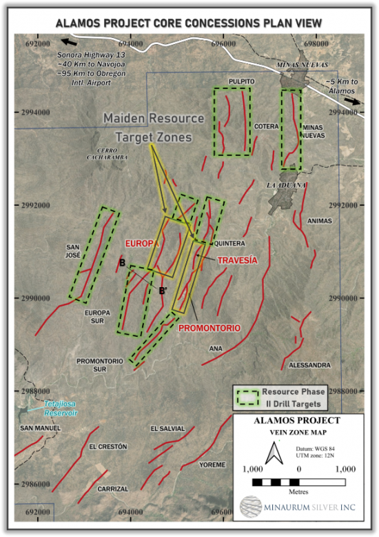Minaurum Silver Inc. (“Minaurum” or the “Company”) (TSXV: MGG) (OTCQX: MMRGF) is pleased to report that six drill rigs are now operating at its Alamos Silver Project as part of the Phase II - 50,000-metre resource expansion drill program. Minaurum will continue step-out drilling on vein zones with established resources at Europa and Promontorio-Travesia, while initiating resource-definition drilling on several additional veins, including San Jose, Quintera, Cotera-Pulpito, and Minas Nuevas.