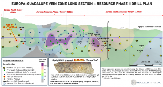 “With the continued success of our step-out drilling at the Europa vein zone, we are pleased to have expanded our drill fleet from four to six rigs,” stated Darrell Rader, President and CEO of Minaurum Silver. “Supported by an inferred resource of 55 million ounces AgEq at Alamos and a fully funded 50,000-metre resource expansion program currently underway, Minaurum is well positioned to deliver an updated mineral resource estimate in the second half of 2026. We anticipate a steady increase in drill results as the expanded fleet advances the program”