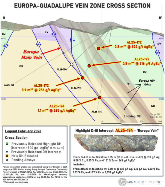 Mineralization at the Europa and Travesia–Quintera zones has intersected high-grade silver over narrower widths that clearly define the margins of the robust silver shoots. The vein system displays a well-developed pinch-and-swell geometry along strike and down-dip, characterized by variations in vein thickness and grade. This continuity is exemplified by Hole AL25-163 at Europa, which returned 12.35 metres grading 408 g/t AgEq, including 3.20 metres of 1,277 g/t AgEq, in a 250-metre step-out (see Minaurum news release dated February 10, 2026), demonstrating a potentially large expansion of the mineralized envelope.