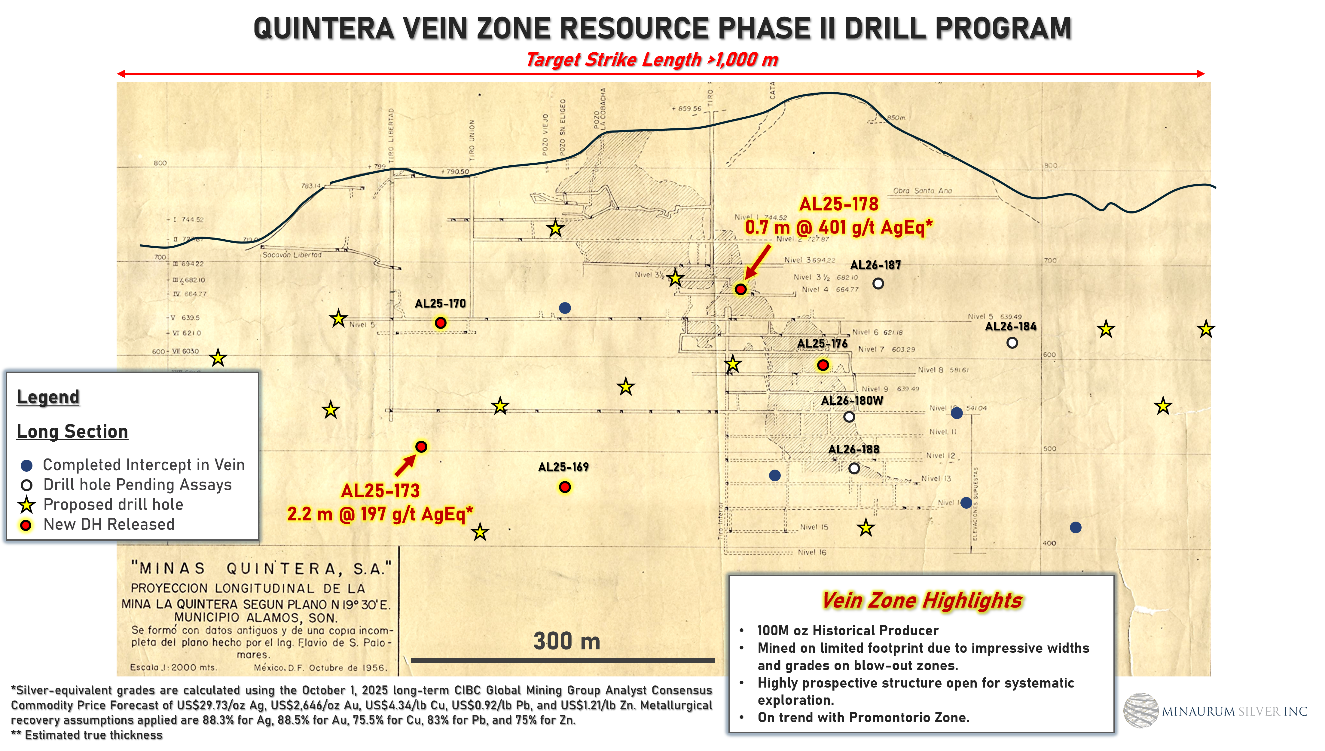 Mineralization at the Europa and Travesia–Quintera zones has intersected high-grade silver over narrower widths that clearly define the margins of the robust silver shoots. The vein system displays a well-developed pinch-and-swell geometry along strike and down-dip, characterized by variations in vein thickness and grade. This continuity is exemplified by Hole AL25-163 at Europa, which returned 12.35 metres grading 408 g/t AgEq, including 3.20 metres of 1,277 g/t AgEq, in a 250-metre step-out (see Minaurum news release dated February 10, 2026), demonstrating a potentially large expansion of the mineralized envelope.