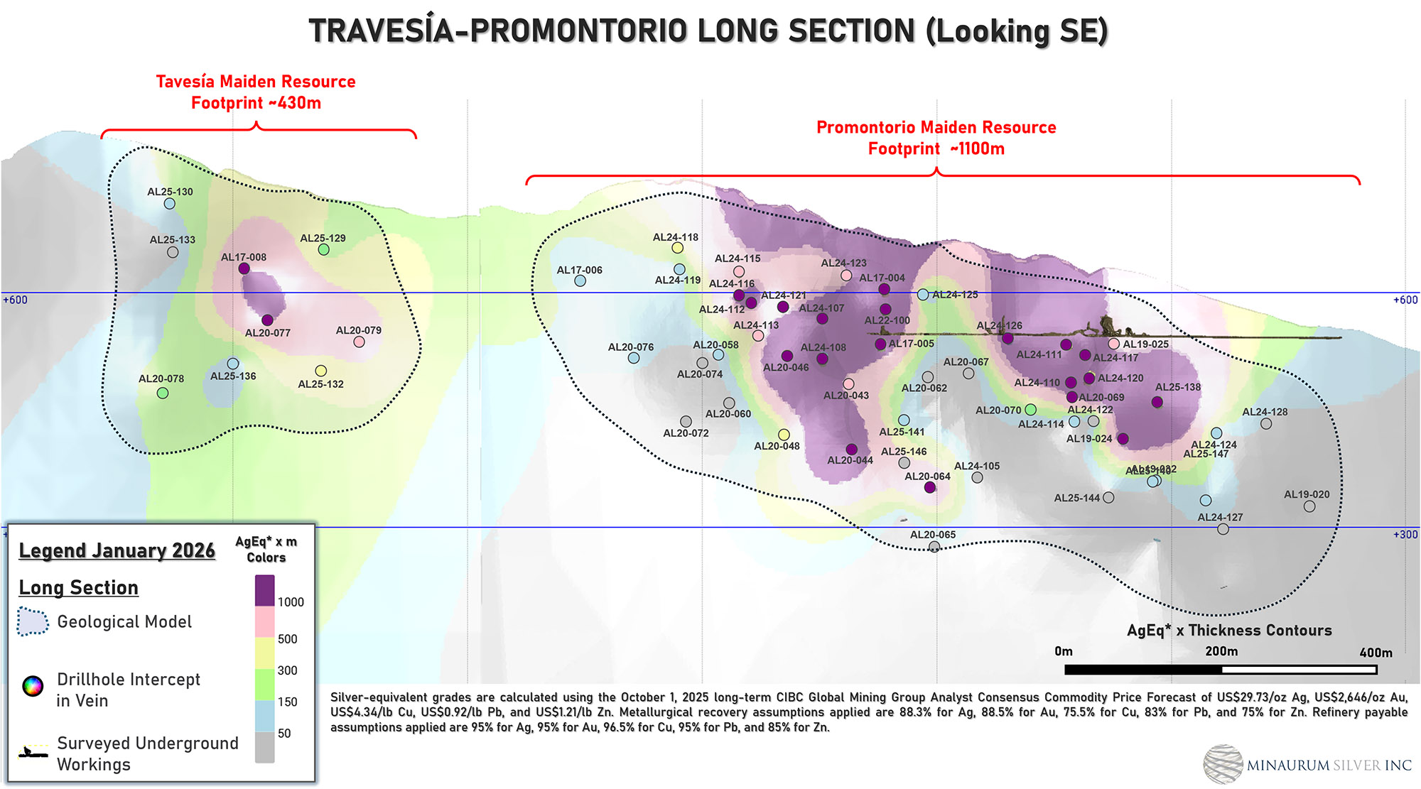 The Alamos Project Resource Estimate is based on the following key assumptions and parameters: specific gravity values of 2.72 for the Promontorio and Travesia veins and 2.63 for the Europa vein, derived from Minaurum’s test work based on 151 wax-coated density measurements; vein domains were modelled to reflect the interpreted vein geology, including vein continuity, thickness, and structural controls; all assays were composited to 1 metre, and grade capping was applied on a vein-by-vein basis, with silver grades capped at up to 3,000 g/t; a 5 m along strike × 1 m across strike × 2.5 m high block size was selected based on geological constraints and potential future mining methods; and block grades for gold, silver, copper, lead, and zinc were estimated using inverse distance squared interpolation; mineral resources were classified as Inferred in accordance with CIM Definition Standards, based on geological confidence, drill hole spacing, sample support, and search criteria. Additional details of the estimation methodology and classification criteria will be provided in the supporting technical report to be filed on the Company’s profile on SEDAR+.
