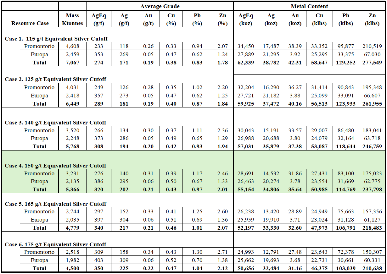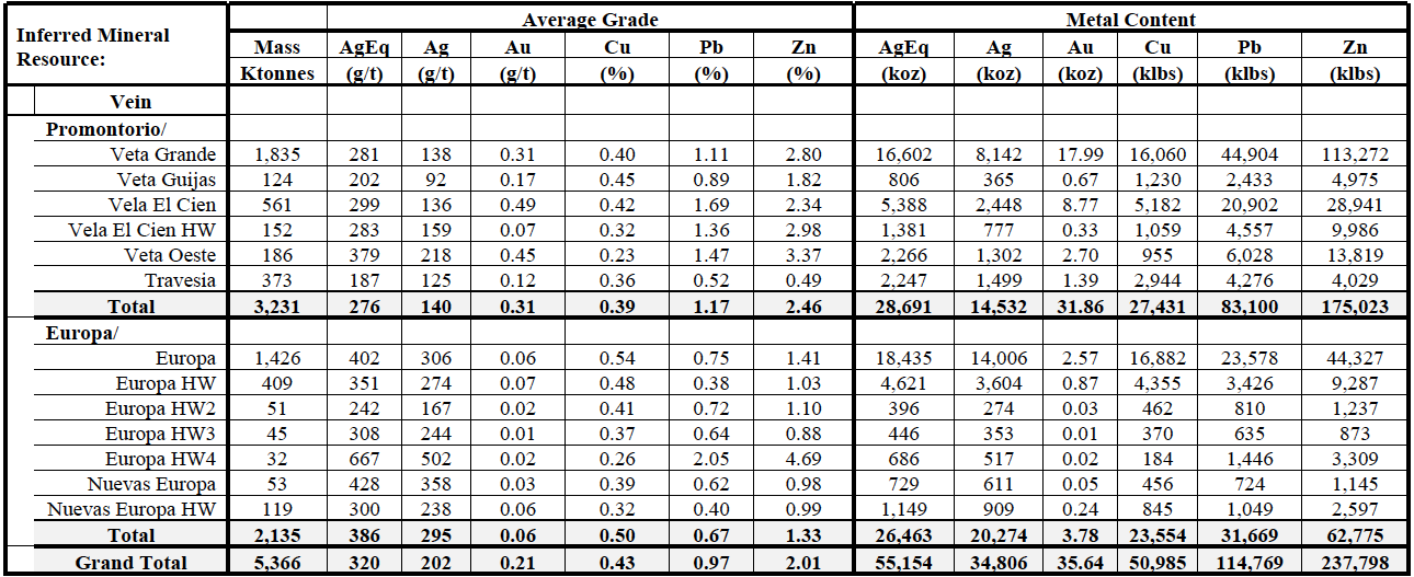 - High Grade Inferred Mineral Resource: Resource Estimate of 5.37 million tonnes (Mt) grading 202 g/t silver, 0.21 g/t gold, 0.43% copper, 0.97% lead, and 2.01% zinc, or 320 g/t silver equivalent (“AgEq”) and containing 34.8 million ounces (“Moz”) of silver; 35,640 ounces of gold; 51.0 million pounds of copper; 115 million pounds of lead; and 238 million pounds of zinc; or 55.2 Moz AgEq (Table 1).