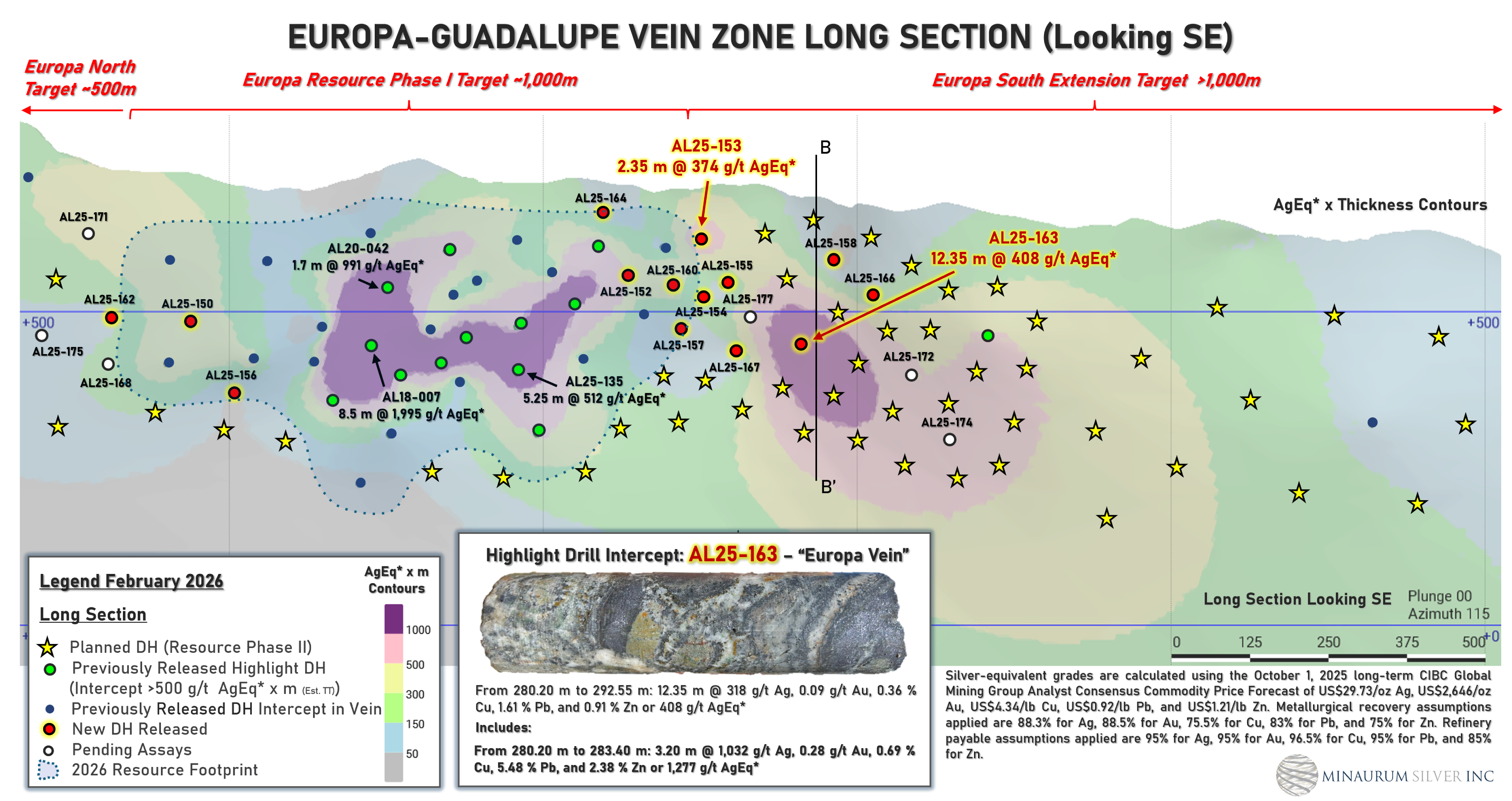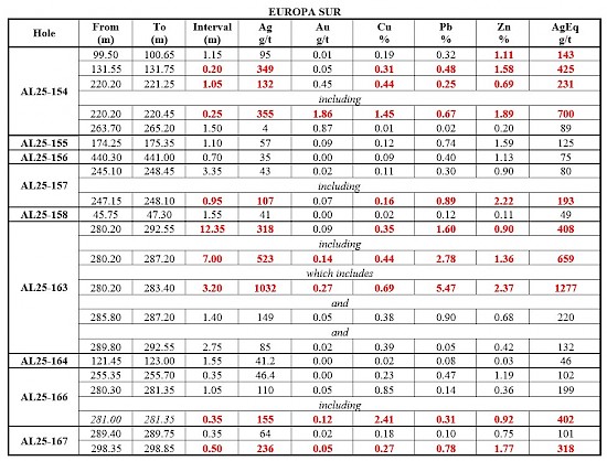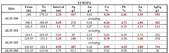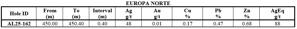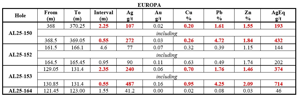 The defined resource of the Europa vein zone occupies about 1 km of its surface-traced 3-km strike length. Recent assay results extend high-grade mineralization along strike, particularly the 1 km extension to the south at Europa. Hole AL25-163 intersected a significant wide interval of 12.35 m zone averaging 408 g/t AgEq, including 3.20 m of 1,277 g/t AgEq (1,032 g/t Ag, 0.278 g/t Au, 0.692% Cu, 5.477% Pb, 2.379% Zn). Hole AL25-154 returned 1.05 m of 231 g/t AgEq, including 0.25 m of 700 g/t AgEq (355 g/t Ag, 1.86 g/t Au, 1.45% Cu, 0.77% Pb, 1.89% Zn) (See Table 1, Figures 2 and 3).