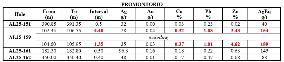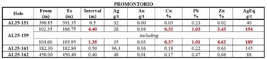 The 1 km-long Promontorio vein zone consists of multiple veins including the Veta Grande and Veta Las Guijas veins. Drilling to date at Promontorio and Promontorio Sur has intersected mineralization in epithermal vein-hosted cutting volcanic and intrusive rocks in addition to skarn/carbonate-replacement (CRD) mineralization hosted by limestone in the footwall of the vein zones. Hole AL25-159 continued mineralization and intersected 4.40 m of 154 g/t AgEq including 1.35 m of 189 g/t AgEq in an epithermal vein (Table 2, Figure 4).