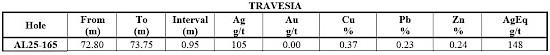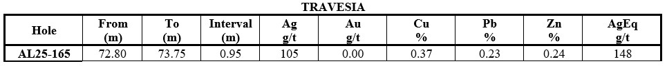 The Travesia vein zone lies to the north of the Promontorio zone and continues north in the hanging wall of the La Quintera vein zone. Hole AL25-165 aimed at the Travesia and La Quintera vein zones in the northern part of the Travesia-Quintera zone, and intersected narrow but encouraging mineralization of 0.95 m of 148 g/t AgEq, including 0.40 m of 221 g/t AgEq in the extension of the Travesia vein.