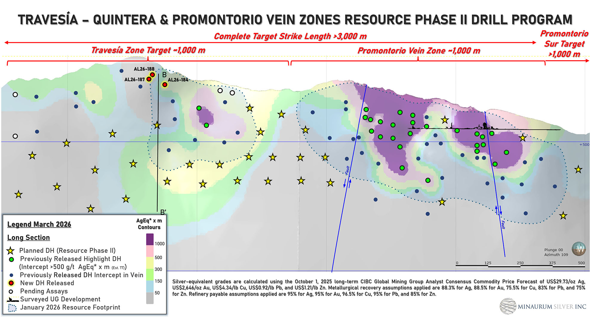 Weight-averaged silver-equivalent grades (AgEq g/t) are based on: October 1, 2025 Long-term CIBC Global Mining Group Analyst Consensus Commodity Price Forecast: Ag $29.73/tr oz, Au $2,646/tr oz, Cu $4.34/lb, Pb $0.92/lb, Zn $1.21/lb. Metallurgical recovery assumption: 88.3% for Ag, 88.5% for Au, 75.5% for Cu, 83% for Pb, 75% for Zn.