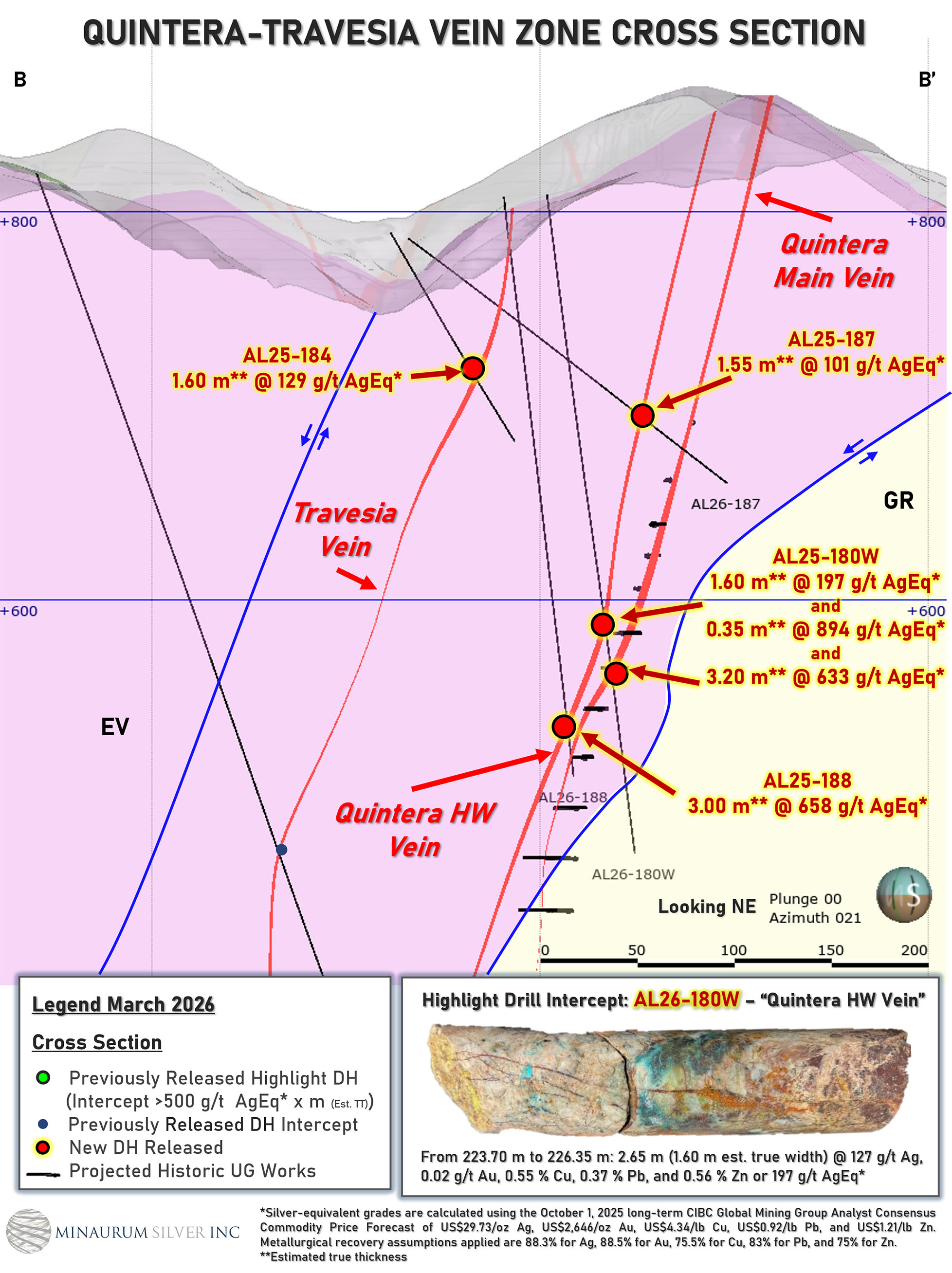 - 5.30 metres of 570 g/t silver (633 g/t silver equivalent “AgEq”), including 2.50 metres of 1,024 g/t silver (1,120 AgEq) (Hole AL26-180W)