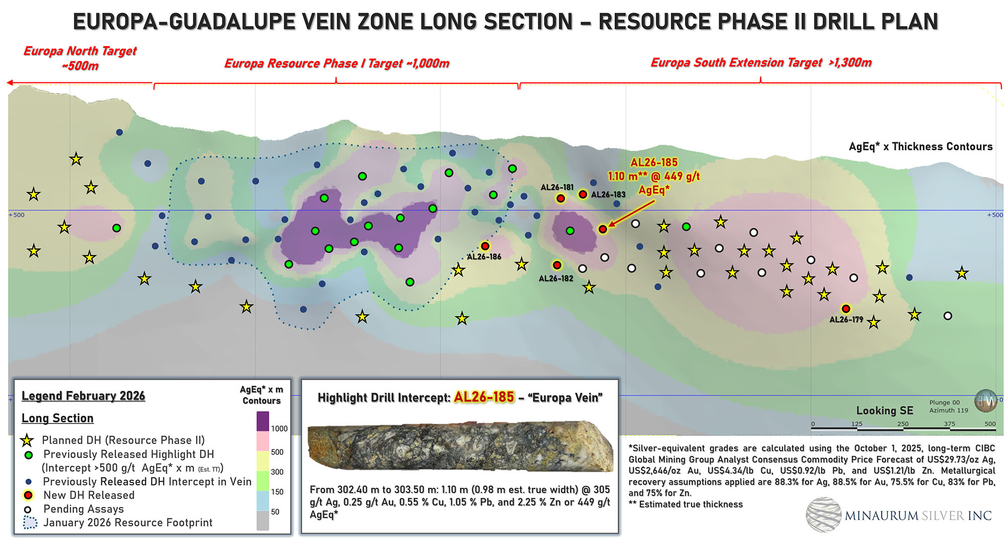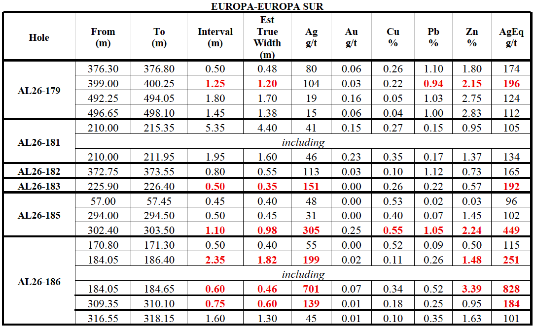 Step-out drilling along strike returned high-grade silver results expanding the Europa Sur vein zone including 1.10 m of 305 g/t Ag (449 g/t AgEq) in hole AL26-185; and 2.35 m of 199 g/t Ag (251 g/t AgEq), including 0.60 m of 701 g/t Ag (828 g/t AgEq) in hole AL26-186 (Table 2; Figure 5). These results expands on the recent successful step-out in hole AL25-163 which returned 12.35 m of 408 g/t AgEq (see news release dated February 10, 2026).