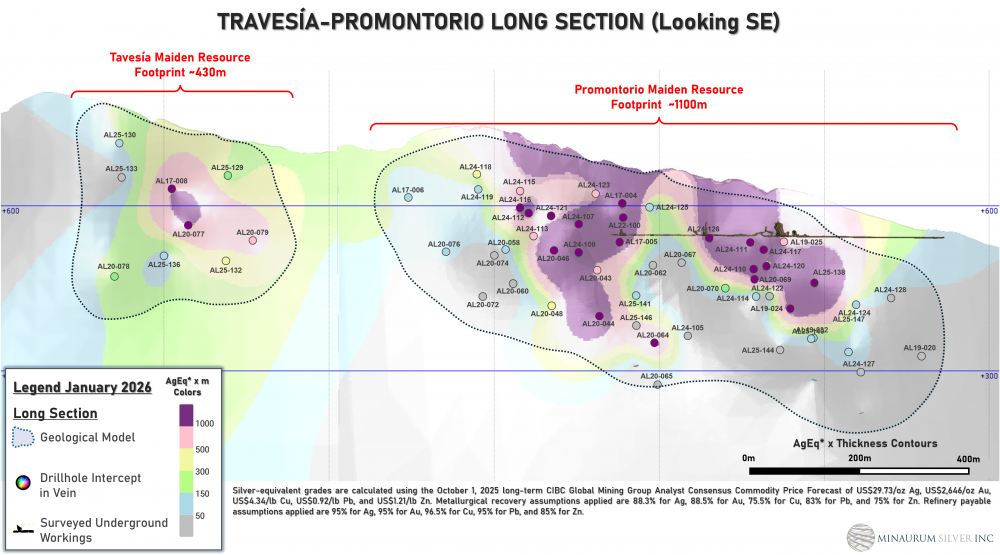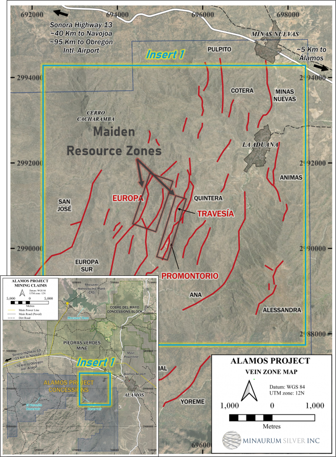 Alamos hosts an initial inferred resource estimate of 55 million ounces silver equivalent grading 320 g/t silver equivalent (see Minaurum news release dated January 28, 2026 and Resource section above) from just 3 of the 26 vein zones namely: Promontorio, Europa, and Travesia vein targets.