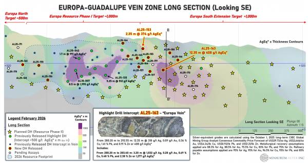 Minaurum extended the Europa vein zone by 250 meters in step-out hole that intersected a significant wide interval of 12.35 m zone averaging 408 g/t AgEq, including 3.20 m of 1,277 g/t AgEq (1,032 g/t Ag, 0.278 g/t Au, 0.692% Cu, 5.477% Pb, 2.379% Zn). Hole AL25-154 returned 1.05 m of 231 g/t AgEq, including 0.25 m of 700 g/t AgEq (355 g/t Ag, 1.86 g/t Au, 1.45% Cu, 0.77% Pb, 1.89% Zn). These holes confirms the continuity of high-grade silver mineralization well beyond the current inferred resource in the Europa Vein Zone.
