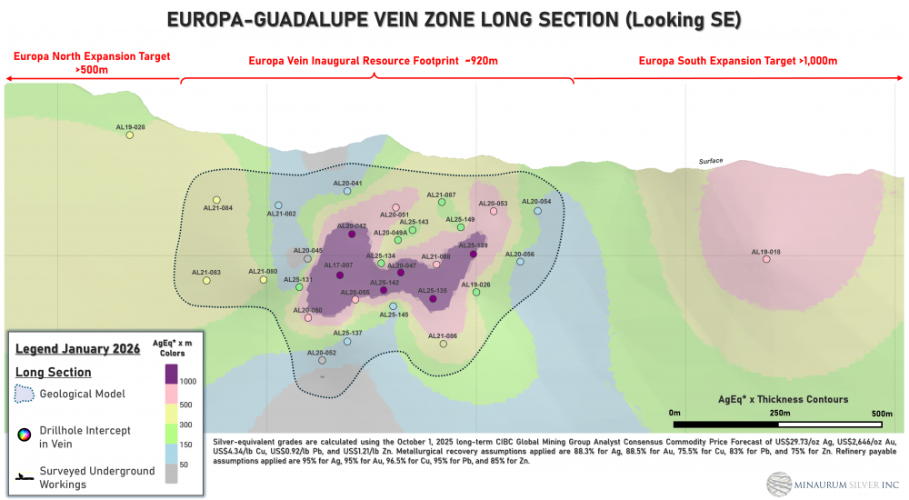 Minaurum owns Alamos 100%, controlling over 37,000 hectares with over 50,000 meters of diamond core drilling completed with an average silver grade of 221 g/t silver (Ag), copper grade is 0.34%, lead grade is 0.99%, zinc grade is 2.06% and 354 g/t silver equivalent (AgEq) with an average width of 4.80 m. Note: 1) Silver-equivalent grades are based on October 1, 2025, Long-term CIBC Global Mining Group Analyst Consensus Commodity Price Forecast: Ag $29.73/oz, Au $2,646/oz, Cu $4.34/lb, Pb $0.92/lb, Zn $1.21/lb. 2) Based on 45,711 meters and 116 diamond drill core hole intersections from 2017-2024 on Promontorio, Europa-Guadalupe, San Jose, Minas Nuevas, Cotera-Pulpito and Alessandra vein zones 3) Based on vein intercepts above 150 g/t AgEq* on a minimum 1-meter interval.