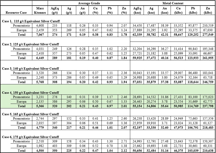 - The Mineral Resource is reported at a cut-off grade of 150 g/t AgEq.